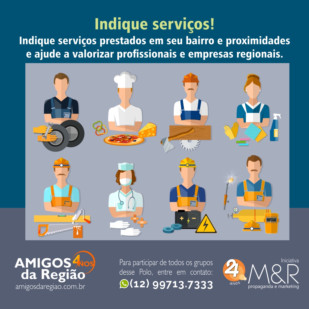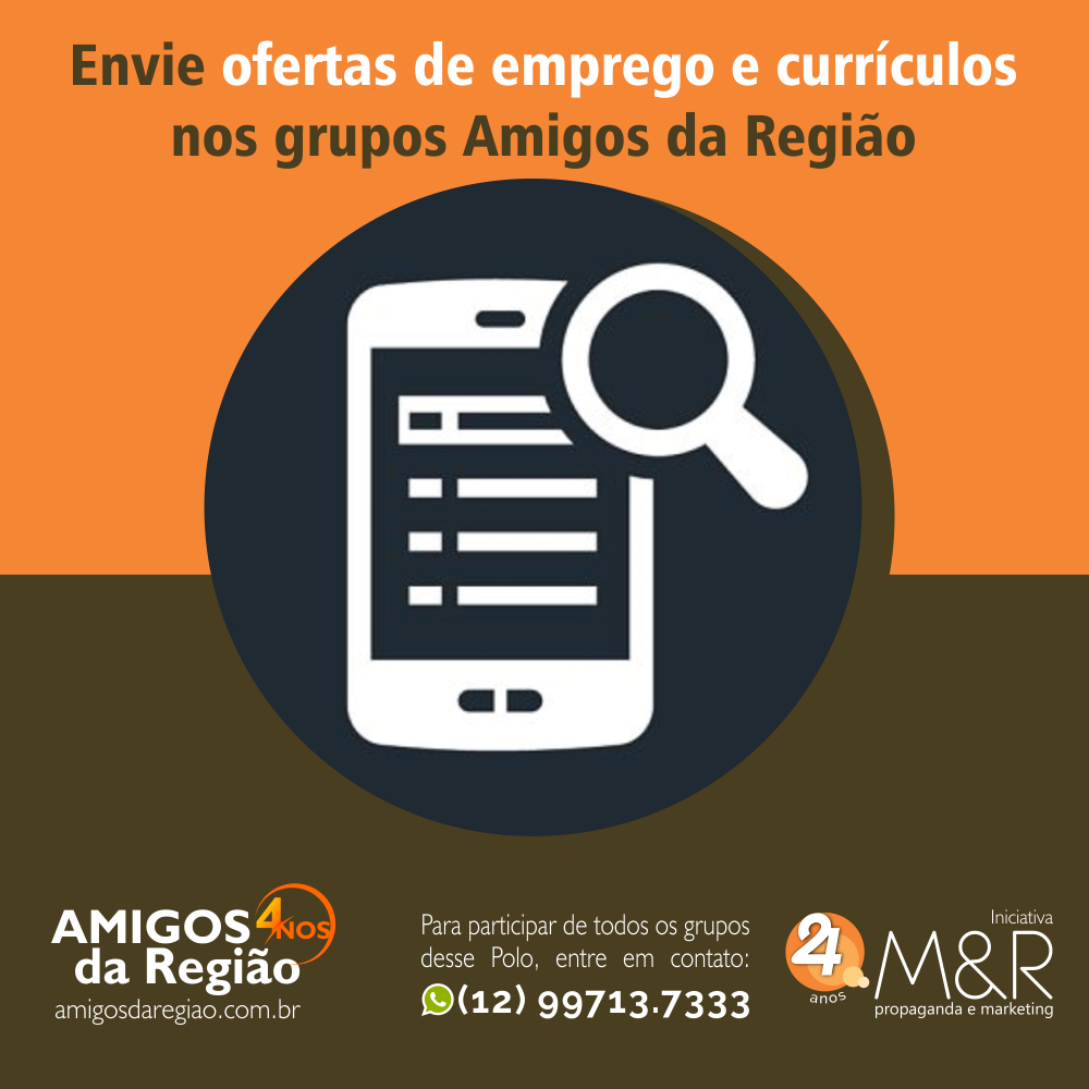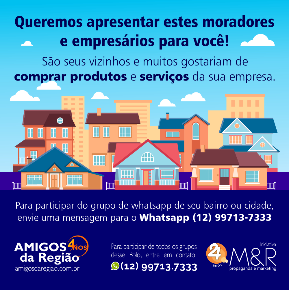 Você, empresário ou morador, participa GRATUITAMENTE do grupo de amigos da sua região no whatsapp! Basta adicionar o número 12 99713.7333 informando nome e bairro, e começar e interagir. Anunciantes têm direito a participarem de TODOS os grupos.