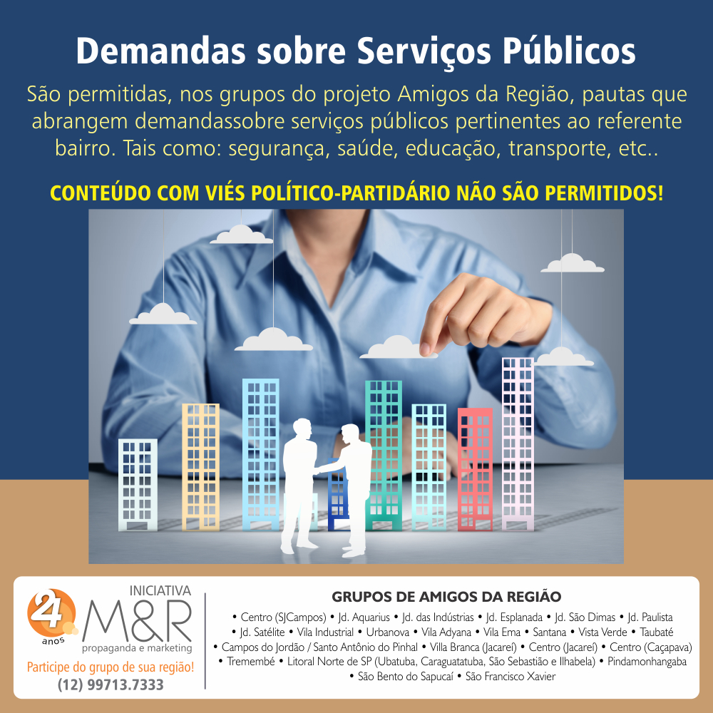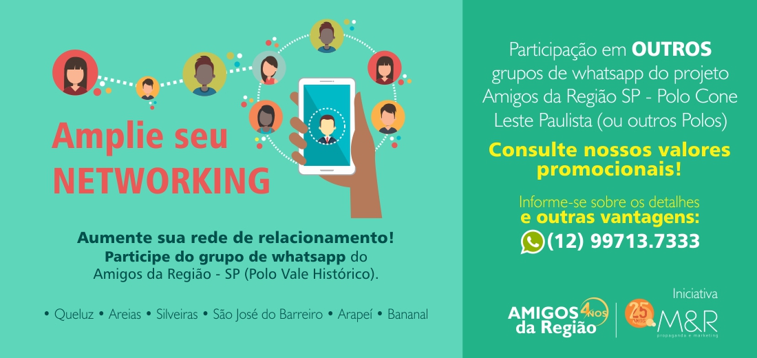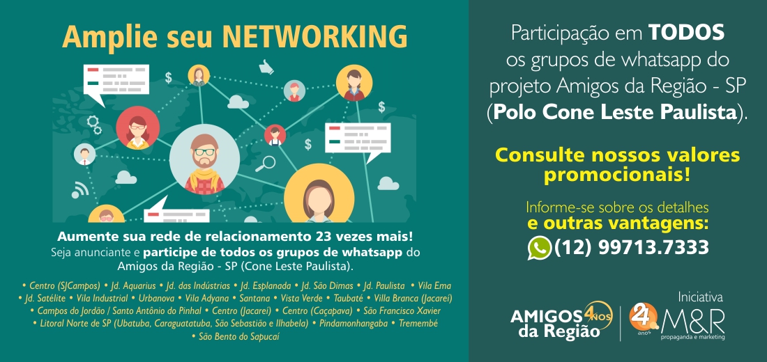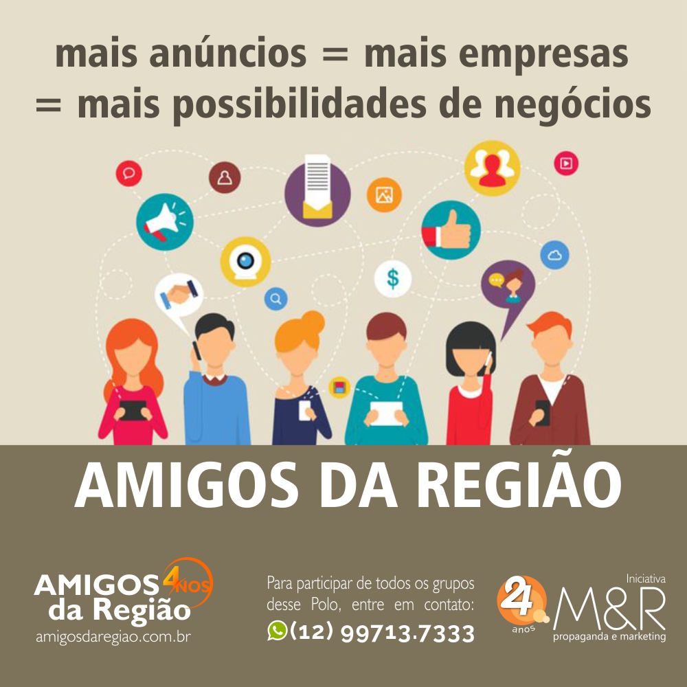 Você, empresário ou morador, participa GRATUITAMENTE do grupo de amigos da sua região no whatsapp! Basta adicionar o número 12 99713.7333 informando nome e bairro, e começar e interagir.