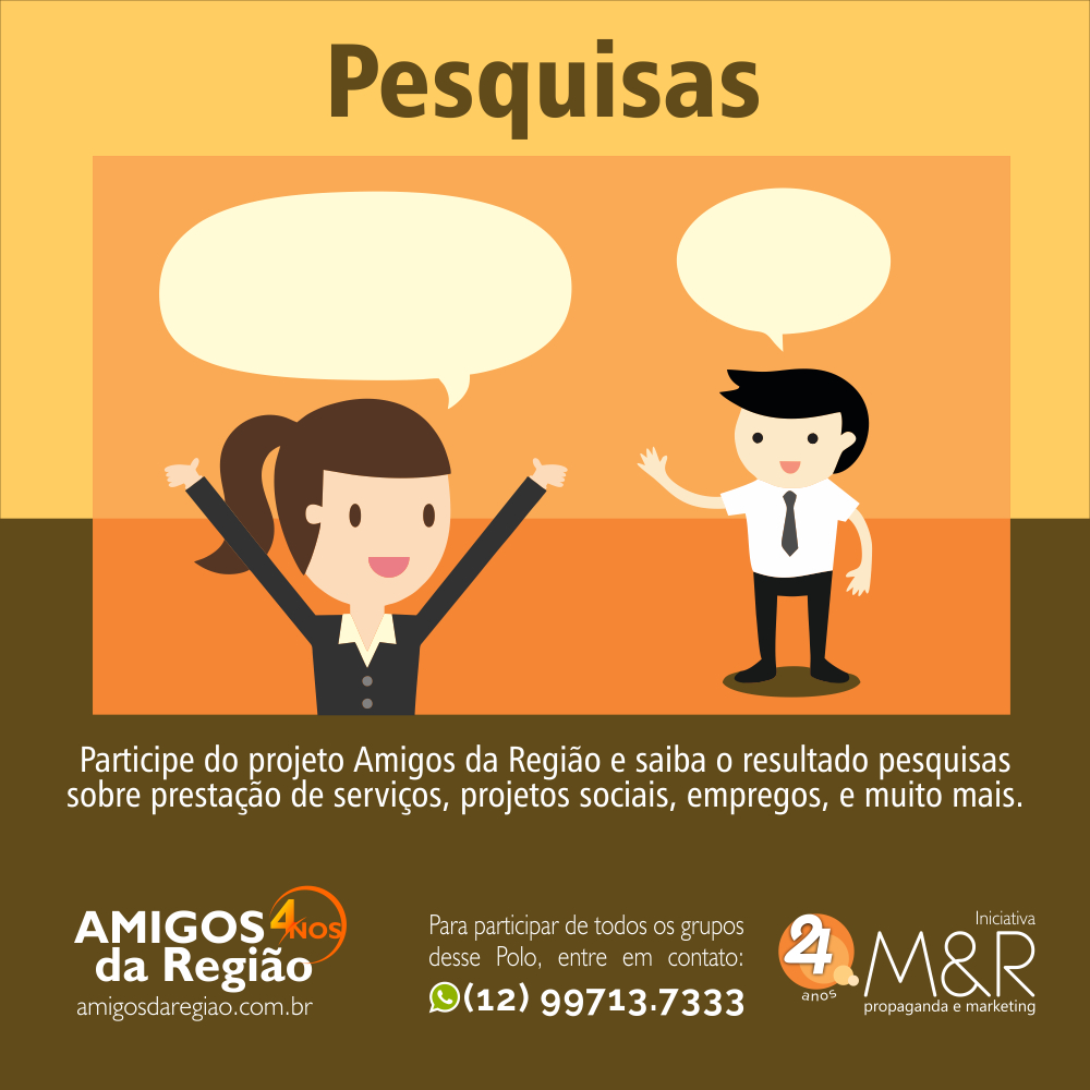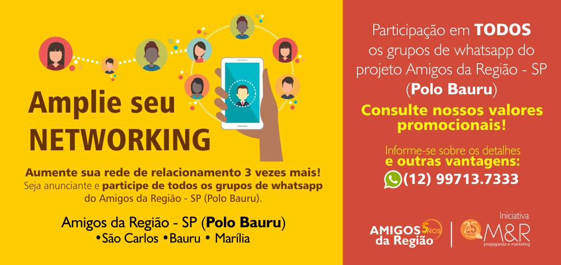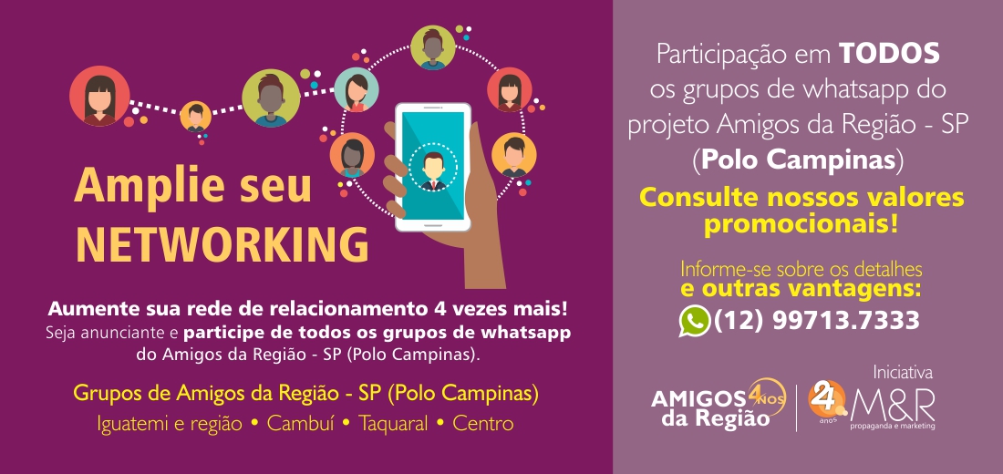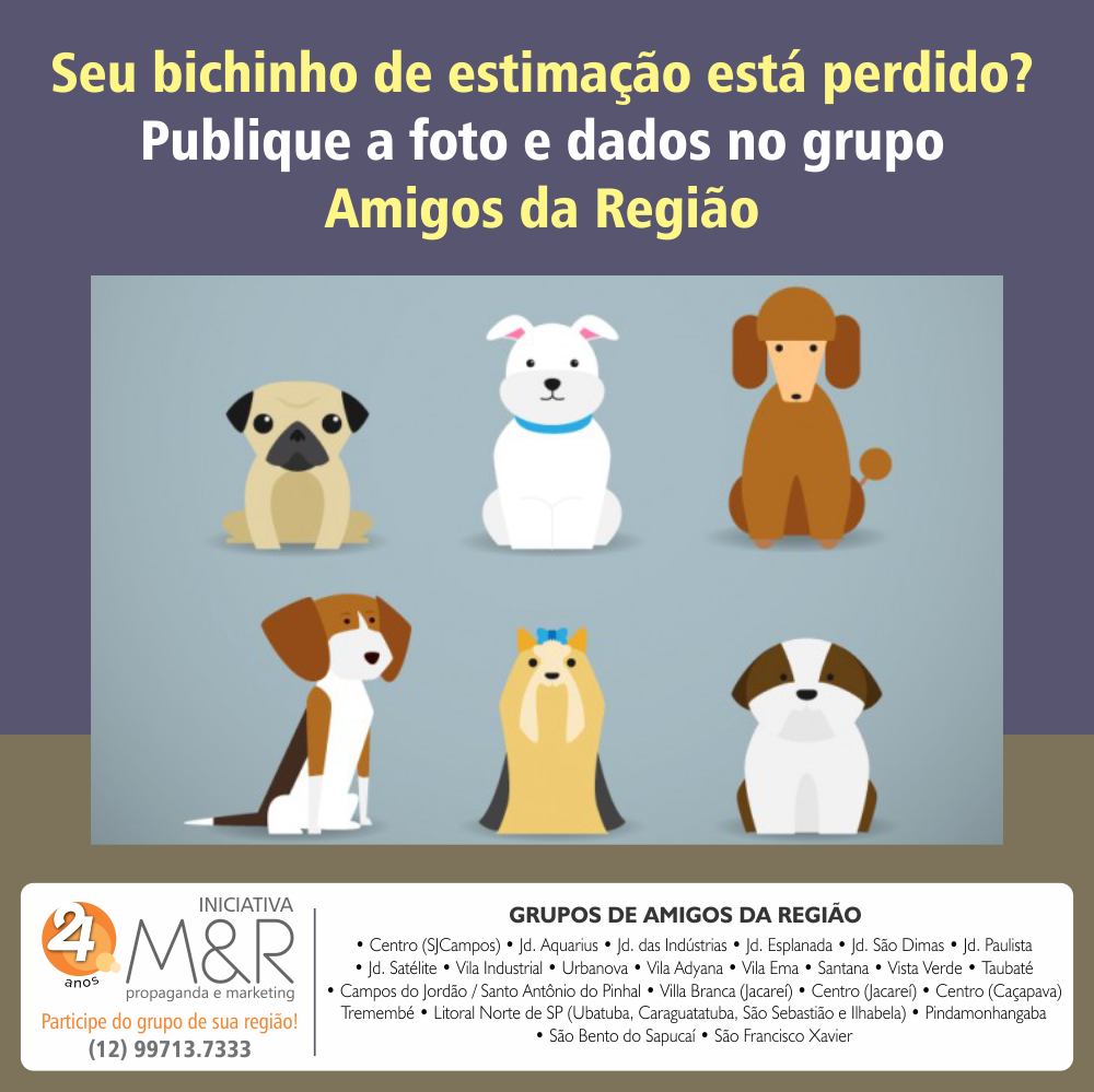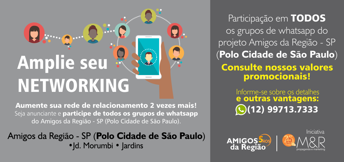 Você, empresário ou morador, participa GRATUITAMENTE do grupo de amigos da sua região no whatsapp! Basta adicionar o número 12 99713.7333 informando nome e bairro, e começar e interagir.