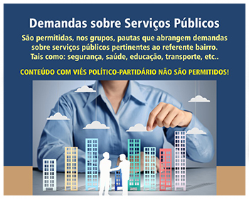 São permitidas, nos grupos, pautas que abrangem demandas sobre serviços públicos pertinentes ao referente bairro. Tais como: segurança, saúde, educação, transporte, etc.. CONTEÚDO COM VIÉS POLÍTICO-PARTIDÁRIO NÃO É PERMITIDO!
